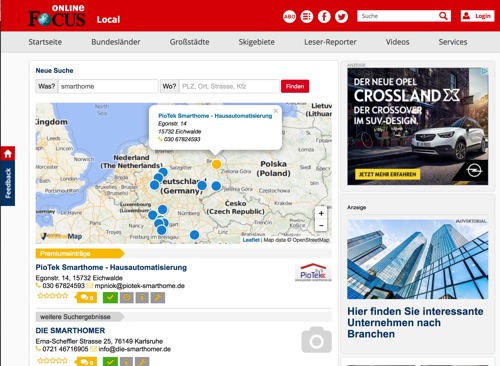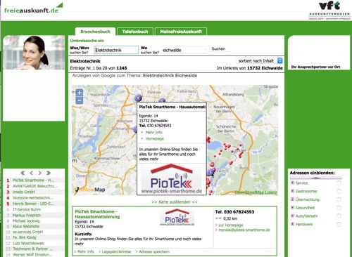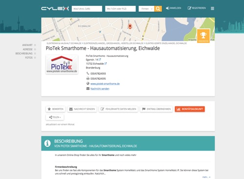 Dipl. Ing. Marco Pniok Chef eines der größten Smarthome- und Hausautomatisierungs- Shops in Deutschland www.piotek-smarthome.de Wir haben den Premiumeintrag gebucht, weil er uns gleich mehrere Vorteile bringt. 1. Wir erscheinen jetzt in sehr vielen Portalen und das auf den ersten Plätzen! 2. Wir erhalten von jedem Portal einen Link auf unsere Seiten. 3. Unsere Kontaktdaten sind nun aktuell auf allen Portalen. 4. Das ist alles günstiger als eine SEO-Agentur damit zu beauftragen. 5. Ich hatte keinerlei Arbeit damit.