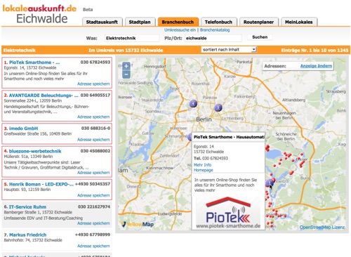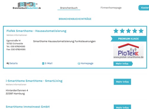 Dipl. Ing. Marco Pniok Chef eines der größten Smarthome- und Hausautomatisierungs- Shops in Deutschland www.piotek-smarthome.de Wir haben den Premiumeintrag gebucht, weil er uns gleich mehrere Vorteile bringt. 1. Wir erscheinen jetzt in sehr vielen Portalen und das auf den ersten Plätzen! 2. Wir erhalten von jedem Portal einen Link auf unsere Seiten. 3. Unsere Kontaktdaten sind nun aktuell auf allen Portalen. 4. Das ist alles günstiger als eine SEO-Agentur damit zu beauftragen. 5. Ich hatte keinerlei Arbeit damit.